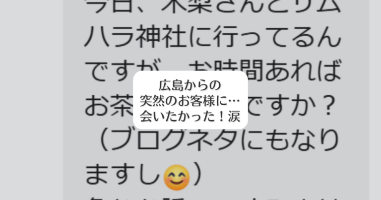 連休の中日。 わたしは普通に 仕事だったのですが、 突然の楽しそうなお誘いに 乗れなかったのが 非常に残念です・・・ このブログは、 経営者を支援する 榎本尚子が、 日々に役立つ … 続きを読む 広島からのお客様に・・・・会いたかった!